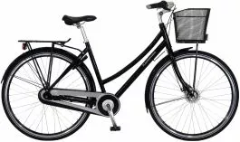 Kildemoes City Dame i moderne udgave med fastmonteret kurv, batteribaglygte, lukket kædekasse, bagagebærer, lås og justerbar frempind for optimal kørestilling.